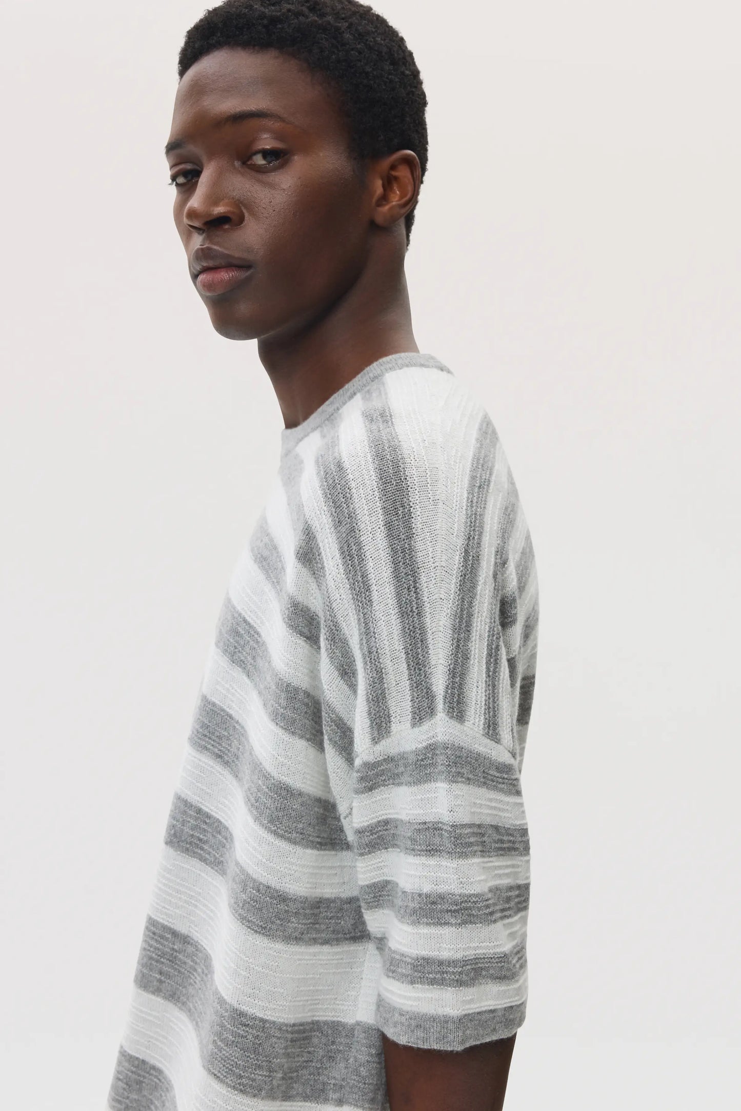 Our textural stripe tee offers luxuriously soft cashmere in a relaxed, unisex fit. Light grey and white stripes add a touch of visual interest, making it the perfect statement piece for effortless everyday style.