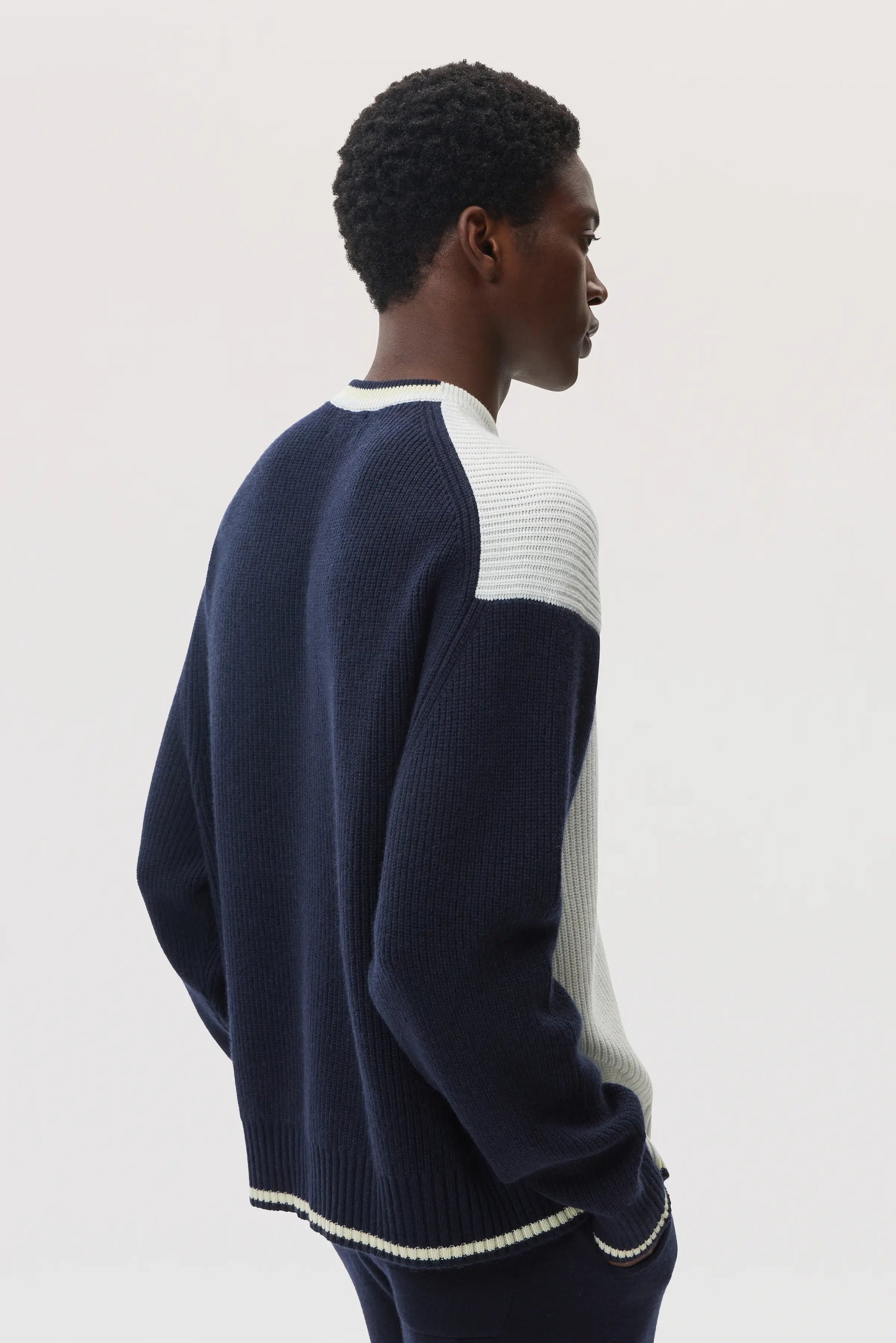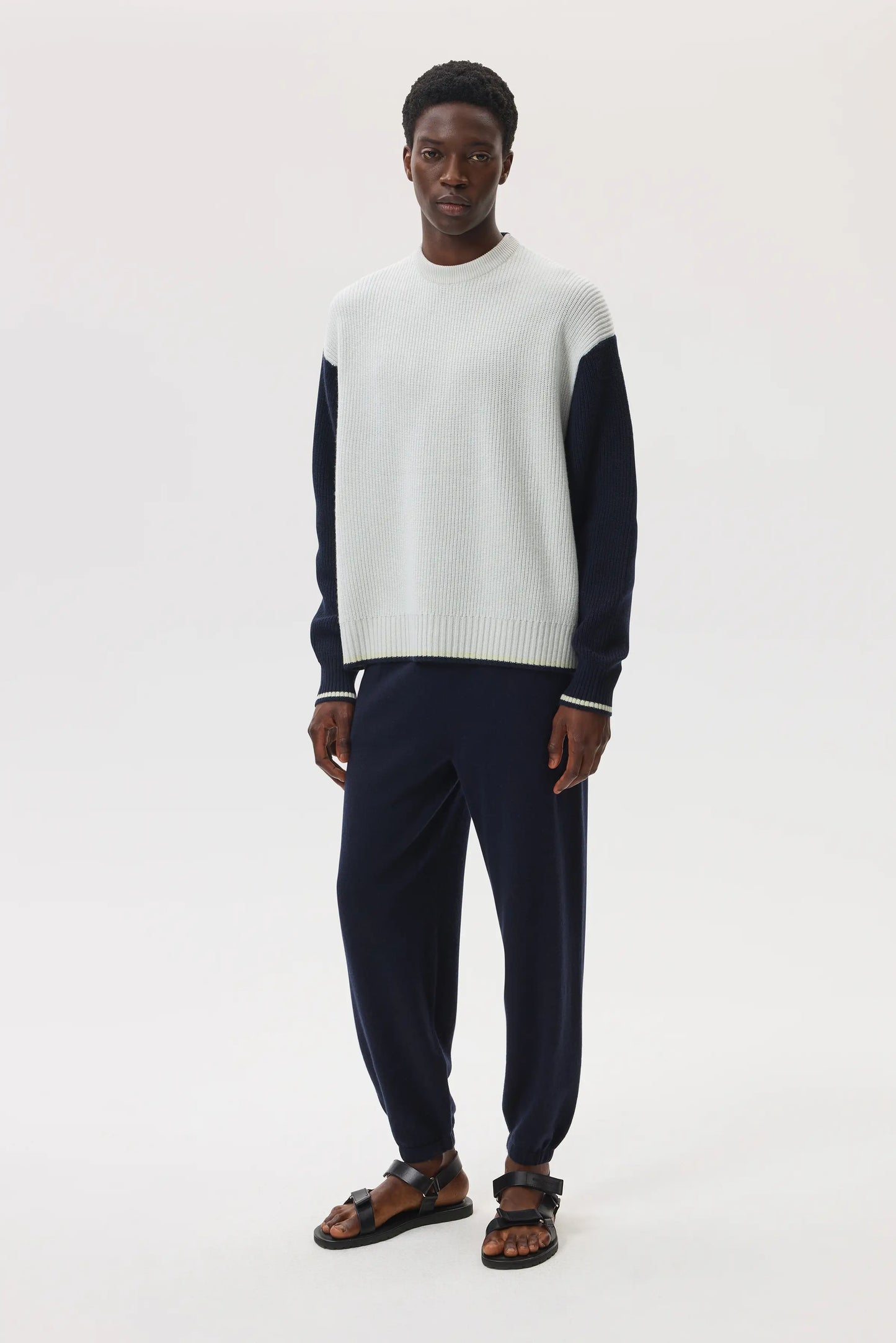 Elevate your everyday look with our Cashmere Navy and White Colour Block Relaxed Rib Crew Jumper. Crafted from soft, luxurious cashmere, this midweight sweater offers ultimate comfort and versatility. The relaxed ribbed detailing provides a flexible fit, while the bold navy and white colour block design adds a contemporary, stylish touch.