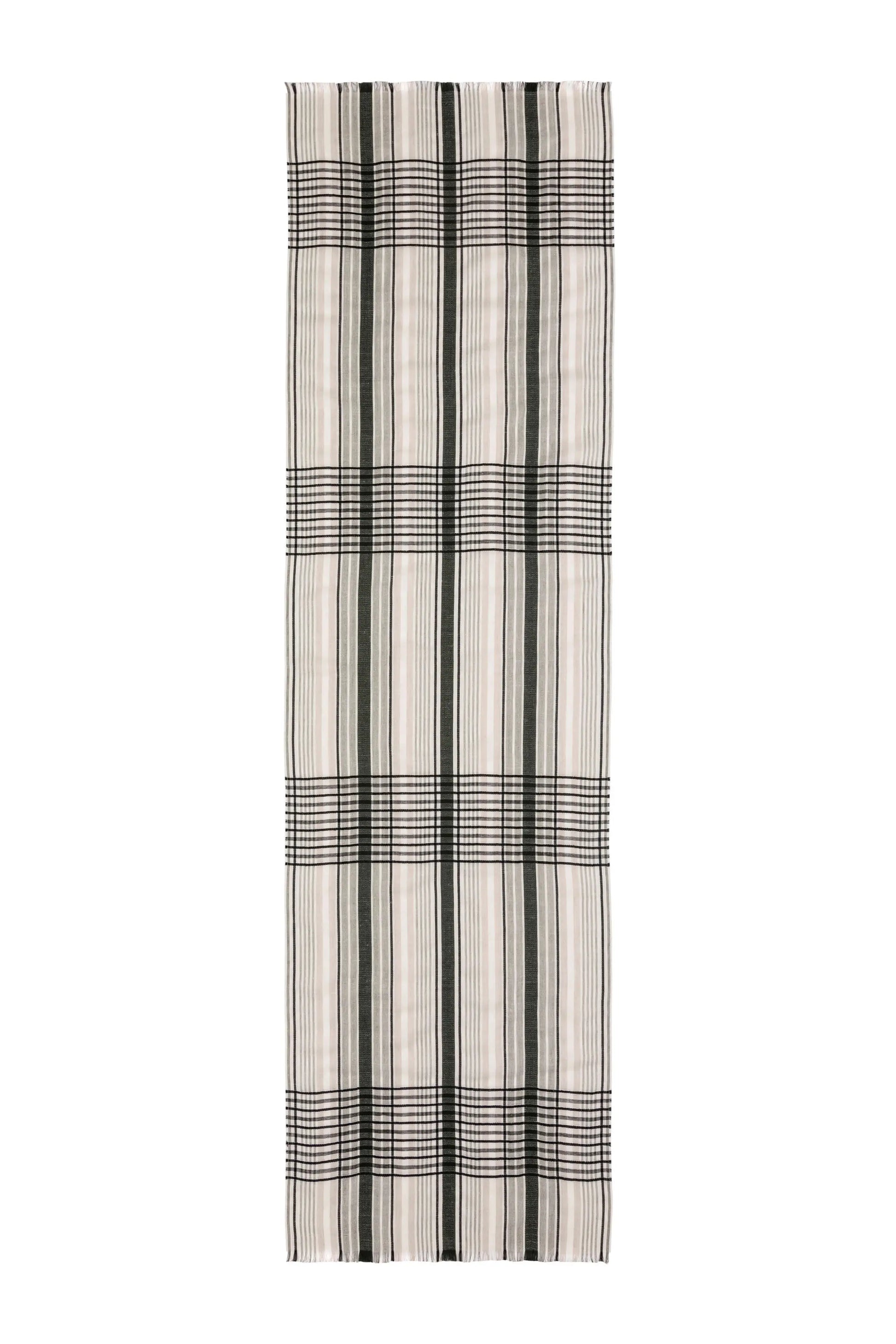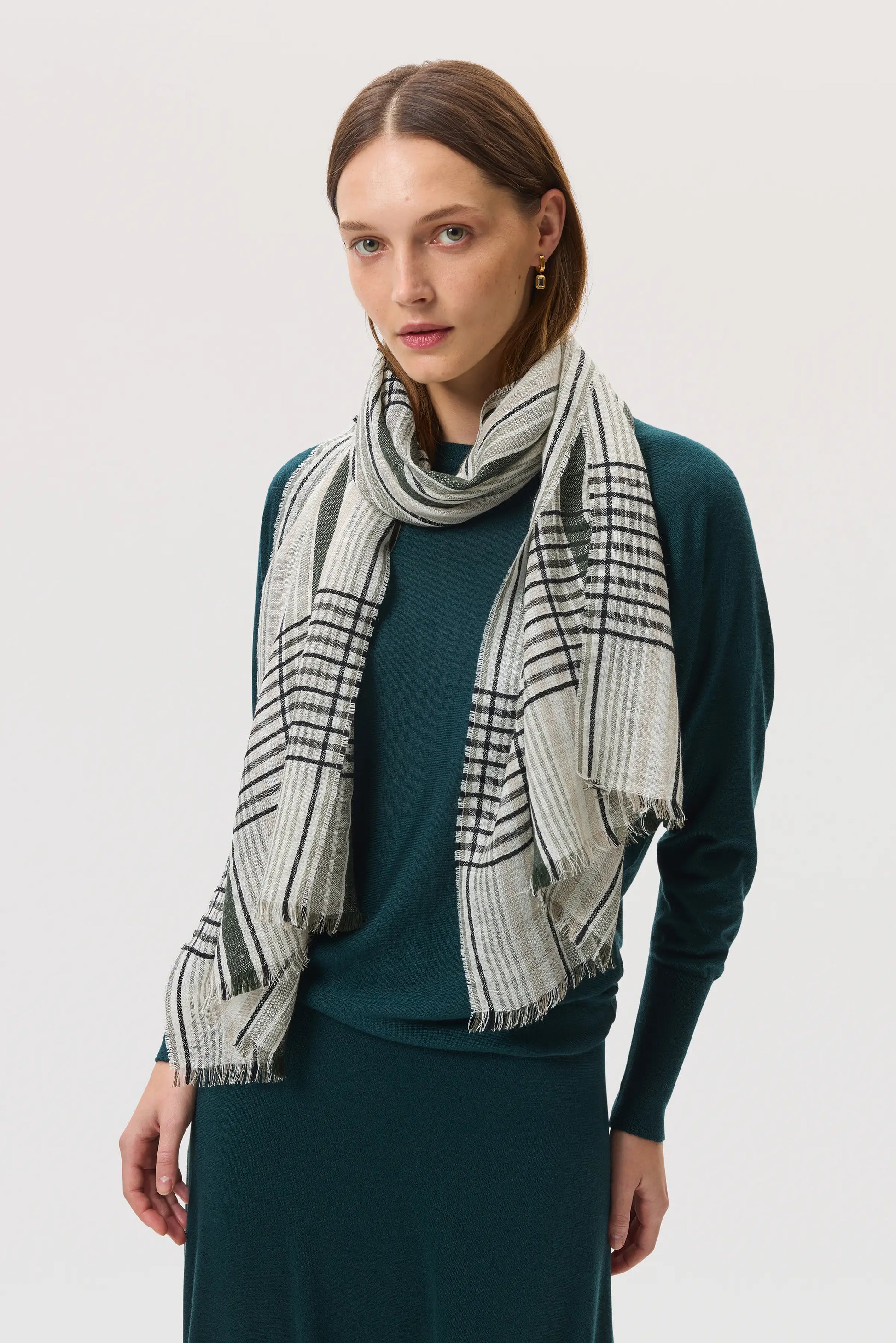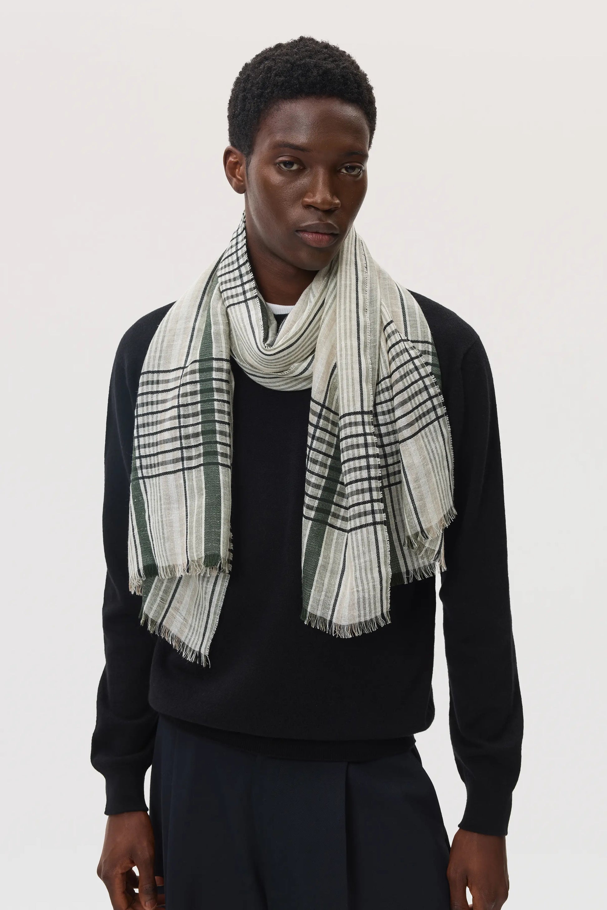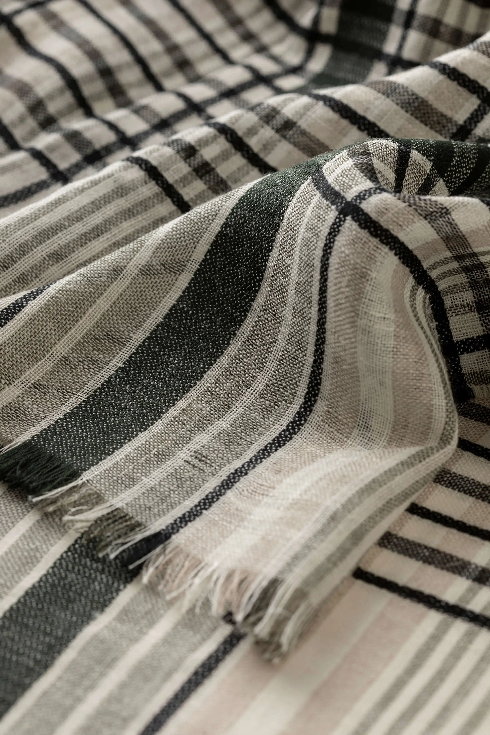 Crafted from a luxurious blend of wool, silk, and linen, this lightweight scarf boasts a stunning graphic design of contrasting stripes and checks.