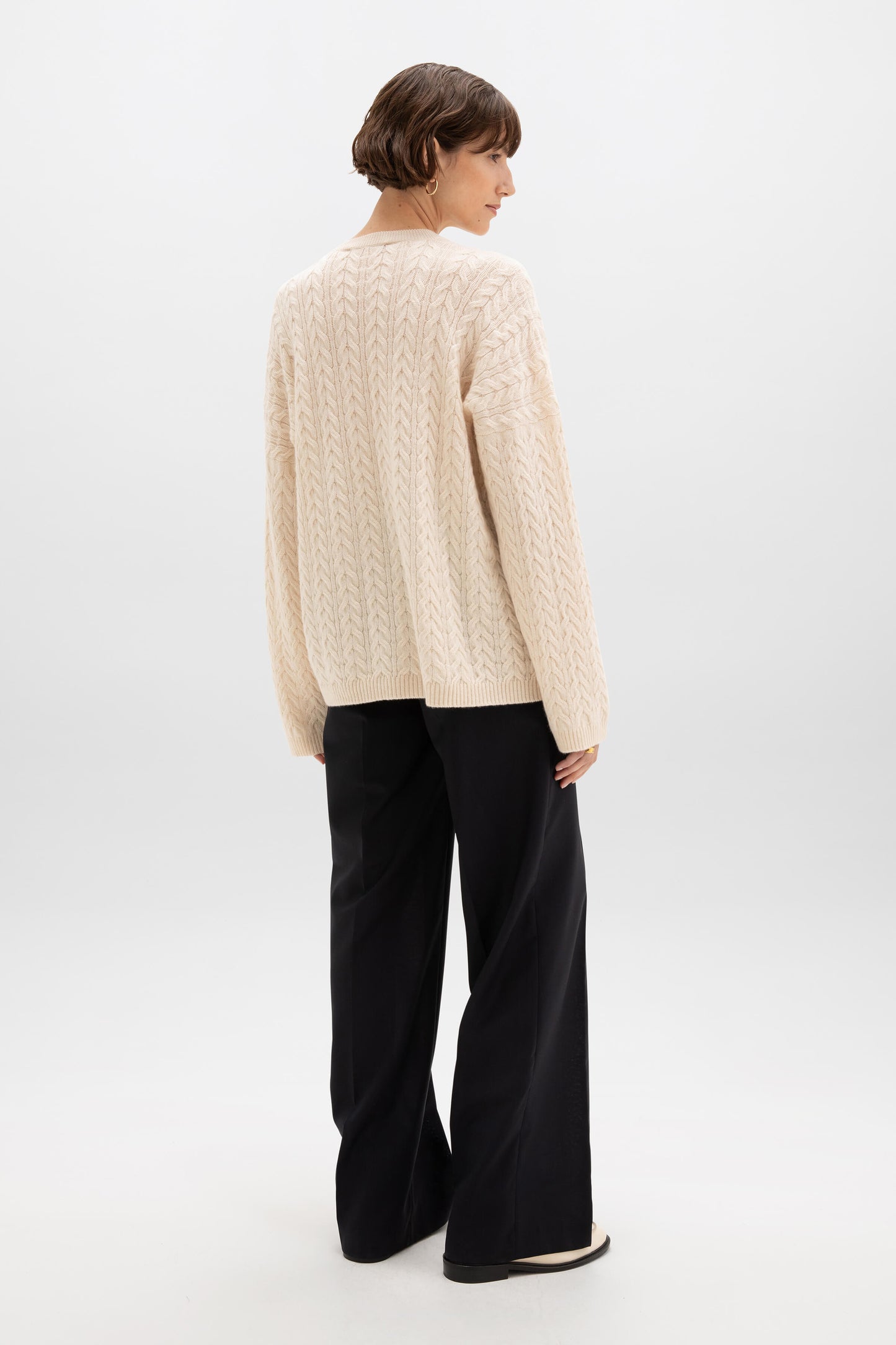 We combine gauzy, lightweight cashmere with a classic Aran cable pattern to create the ultimate knit. Dropped shoulders and wider armholes offer a relaxed silhouette, with button detailing on the sleeves.