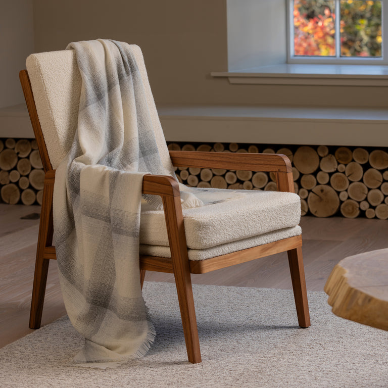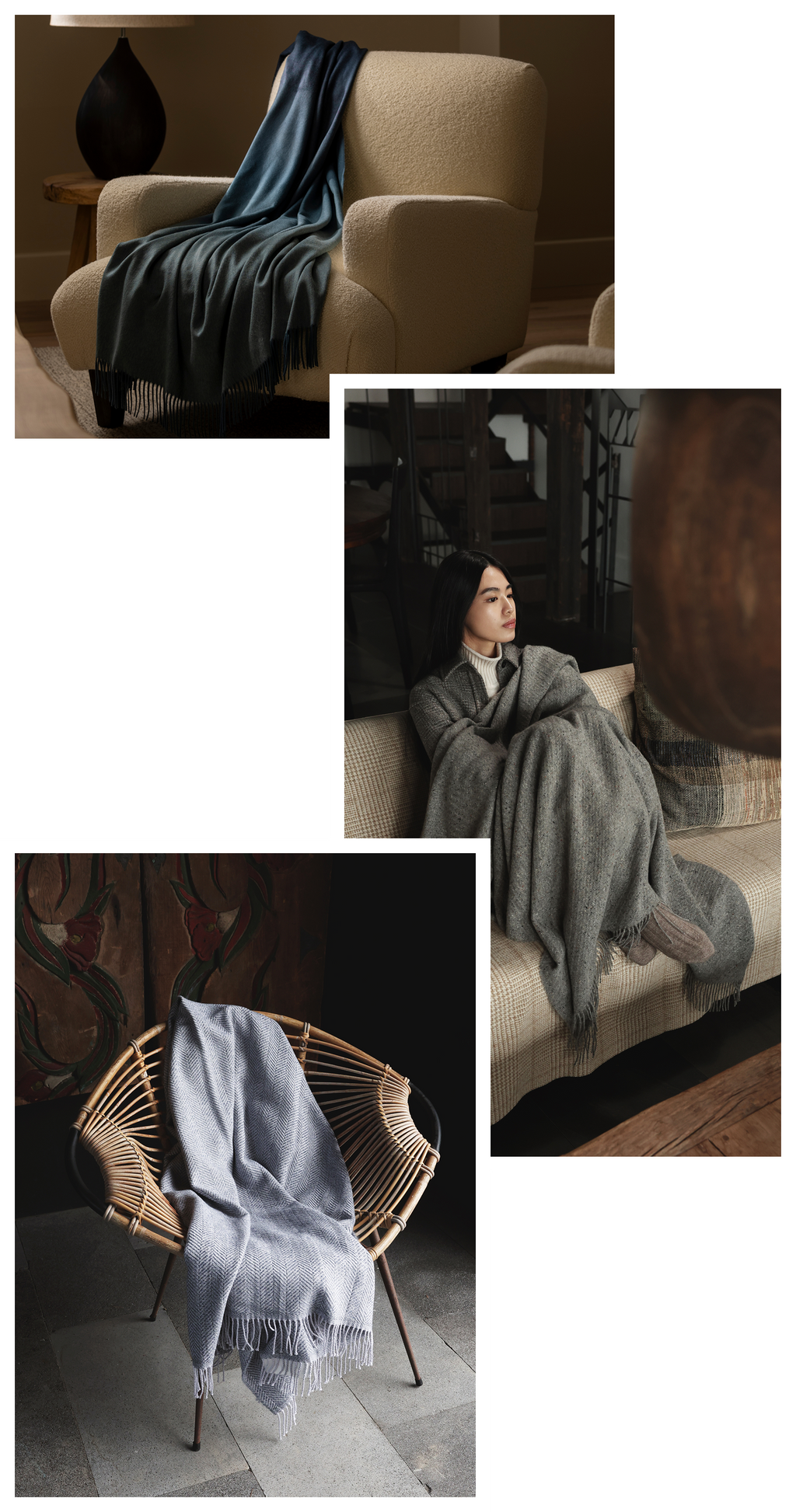 一生使えるデザイン: ブランケットとスローのコレクションは、柔らかなニュートラルトーンから大胆なチェック柄、季節のカラーまで、あらゆるお部屋や空間にマッチするタイムレスなデザインを取り揃えています。軽やかなメリノウールのスロー、ゆったりとしたラップ、そしてエレガンスと実用性を兼ね備えた贅沢なピュアカシミアブランケットからお選びください。