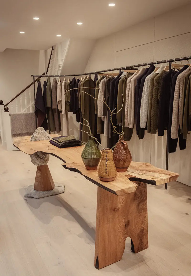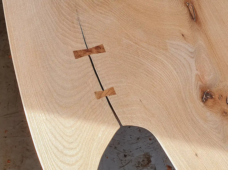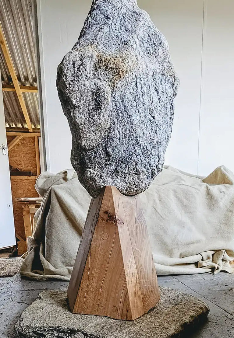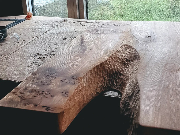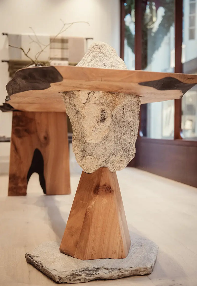 この特注テーブルは、スコットランド高地の素材のみで作られています。彫刻的な脚のベースとなるスコットランド産のバールエルムは、北海岸産のルイス紀片麻岩とともにトーテム彫刻のような、天然の力強い要素と洗練された要素が融合した作品となっています。バールエルムの木で脚を作り、生きたエッジのエルム材 (バールアッシュ) の天板をテーブルの表面として使用しています。自然なエッジは黒く焦がされており、木の元の形の輪郭と、木製テーブルトップの美しい木目の高度に仕上げられた表面との間に印象的なコントラストを生み出しています。このプロセスには約 1 か月かかります。荒野の水路で岩を探し、地元の小さな製材所から木材を調達することから始まります。作品が組み合わさっていく様子を見るのは、深いやりがいを感じます。テーブルの表面に現れるように石を慎重に刻むのは、長く繊細なプロセスです。最初から最後まで重厚で手作りです。その他の特徴には、手彫りの成長年輪と、エルムの蝶節があります。この作品はスコットランドの自然の美しさを余すところなく表現しています。