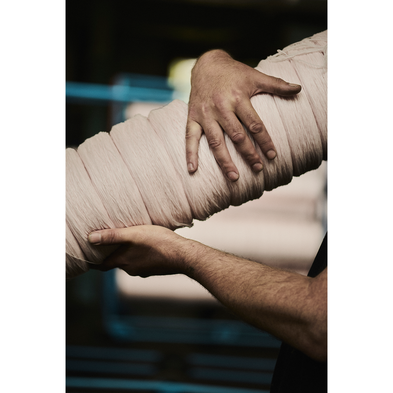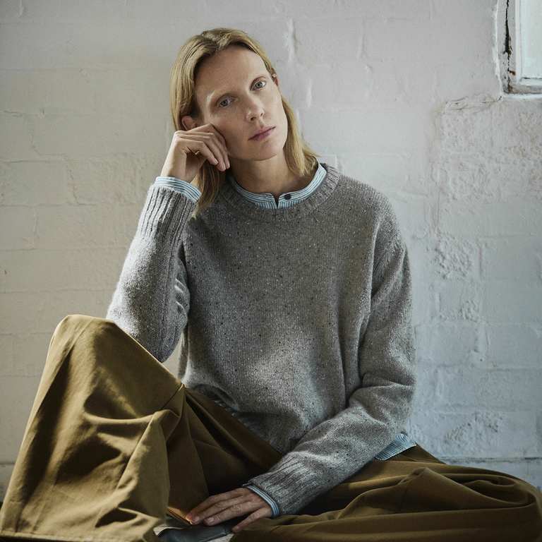アイルランド北西部で伝統的に紡がれるドニゴール糸は、美しいまだら模様を生み出す、多彩なネップや斑点模様で知られています。ネップとは、繊維の小さな斑点、つまり節で、意図的に糸に加えられることで、ざらざらとしたまだら模様のような質感を生み出します。これらのネップは通常、ベースとなる糸とは対照的な色をしており、完成した生地にツイードのような風合いを与えます。スコットランドの熟練したチームによって、これらの職人技が光る糸は100%ピュアカシミアで紡がれ、視覚的な豊かさと並外れた柔らかさを兼ね備えたニットウェアコレクションが生まれます。