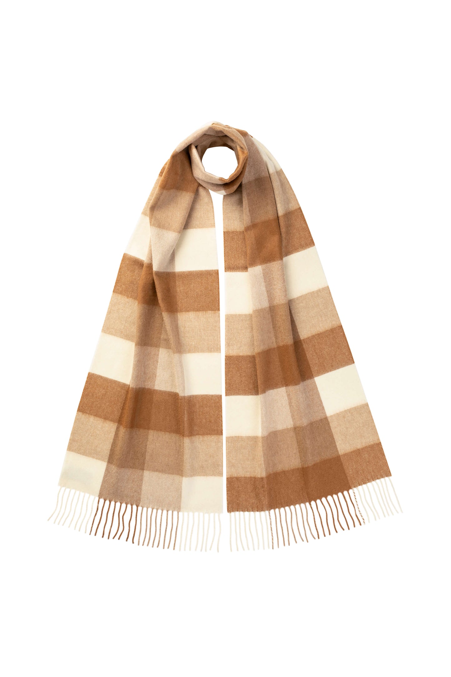 スコットランドで織られたブロックチェックのカシミアとビクーニャのスカーフ。 この超軽量の傑作は、世界最高級の繊維 2 種類をブレンドして作られており、非常に軽量でありながら保温性も抜群です。 これまでにない贅沢を体験してください。