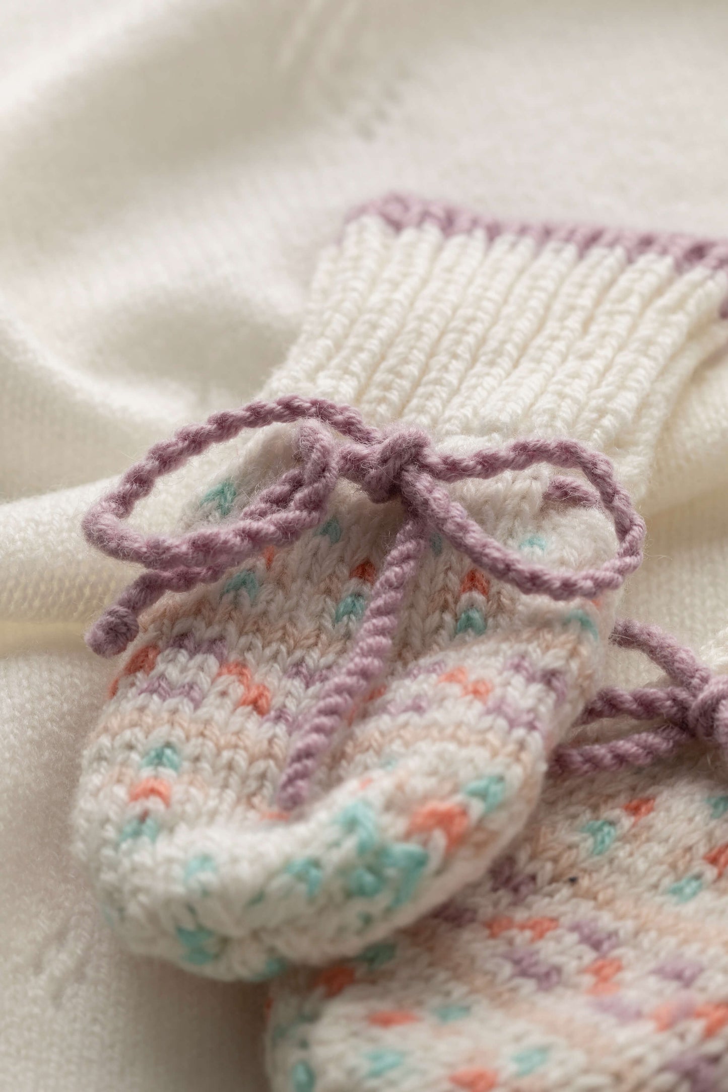 モーブピンクのベビー用フェアアイル・ミトンをお披露目。 私たちはこの繊細なカシミアのミットをフレームの上で作り始め、数段を手編みし、フレームに戻して仕上げる。 このユニークなフェアリー柄は、お揃いのカシミアハットやボティにもあしらわれており、落ち着いたカラーパレットはカシミアチェックのベビーブランケットとも相性がいいので、理想的な新生児ギフトが作れます。