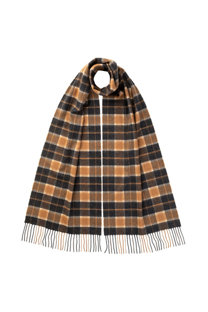 スコットランドのエルギンで作られた、カシミアとビキューナの混紡素材を使用した伝統的なウィンドウペーンチェック柄のスカーフ。 人間の髪の毛の 5 倍の細さを誇る希少なビキューナ繊維を誇り、羽のように軽いビキューナは着心地がよく、優れた断熱性も備えています。