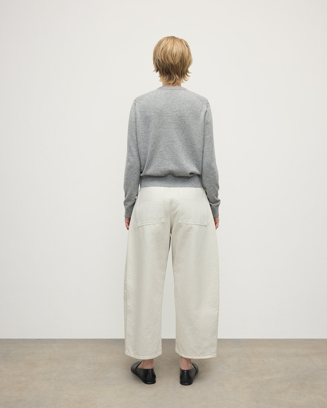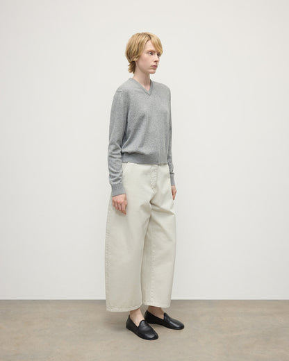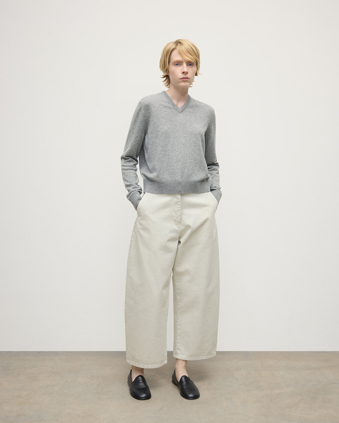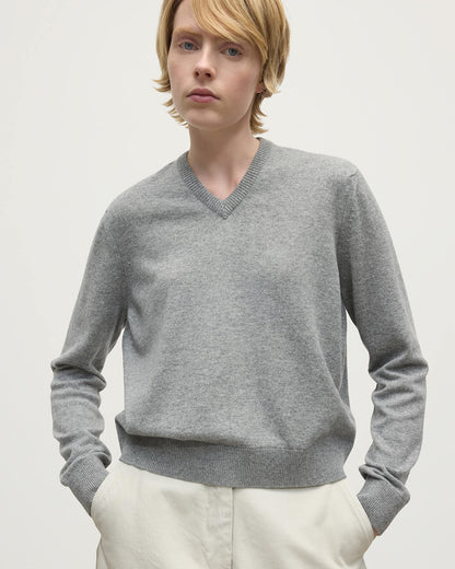 この着心地の良いVネックセーターは、洗練されたモダンなデザインが特徴です。現代的なスタイルを追求し、過去のシーズンよりもやや短めの丈に仕上げています。最高級のキャシミアを使用し、贅沢な着心地を実現した投資価値のあるアイテムです。従来の一体型縫製機ではなく、伝統的な手法で編み上げられています。