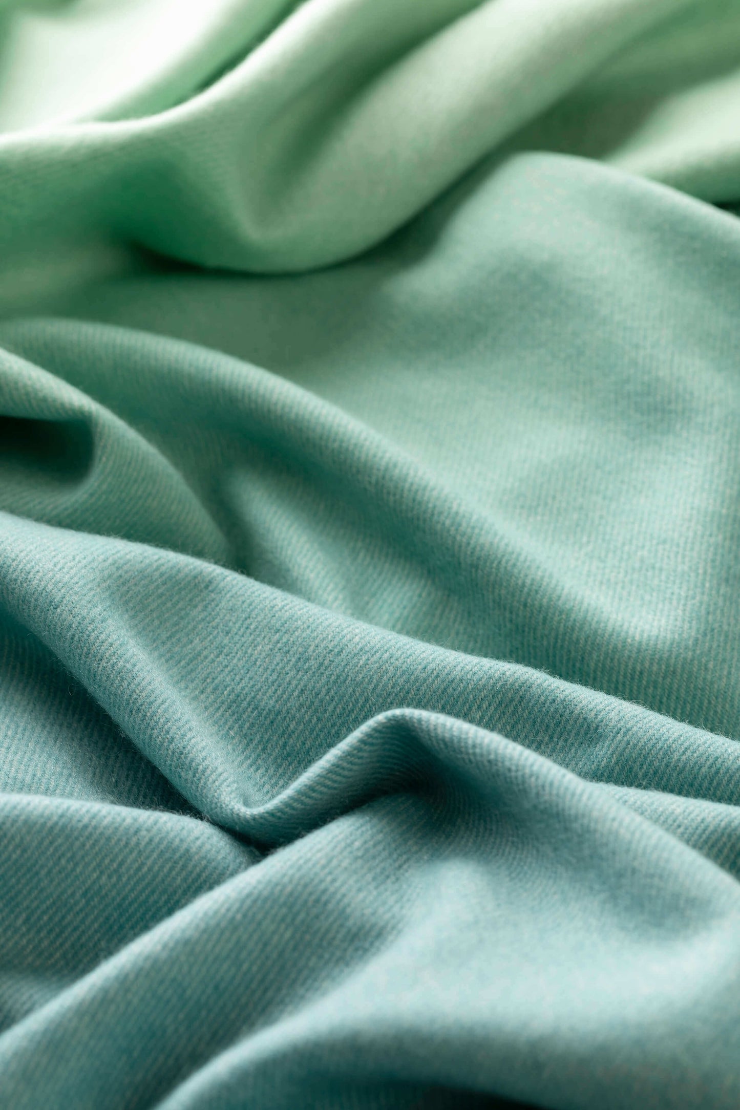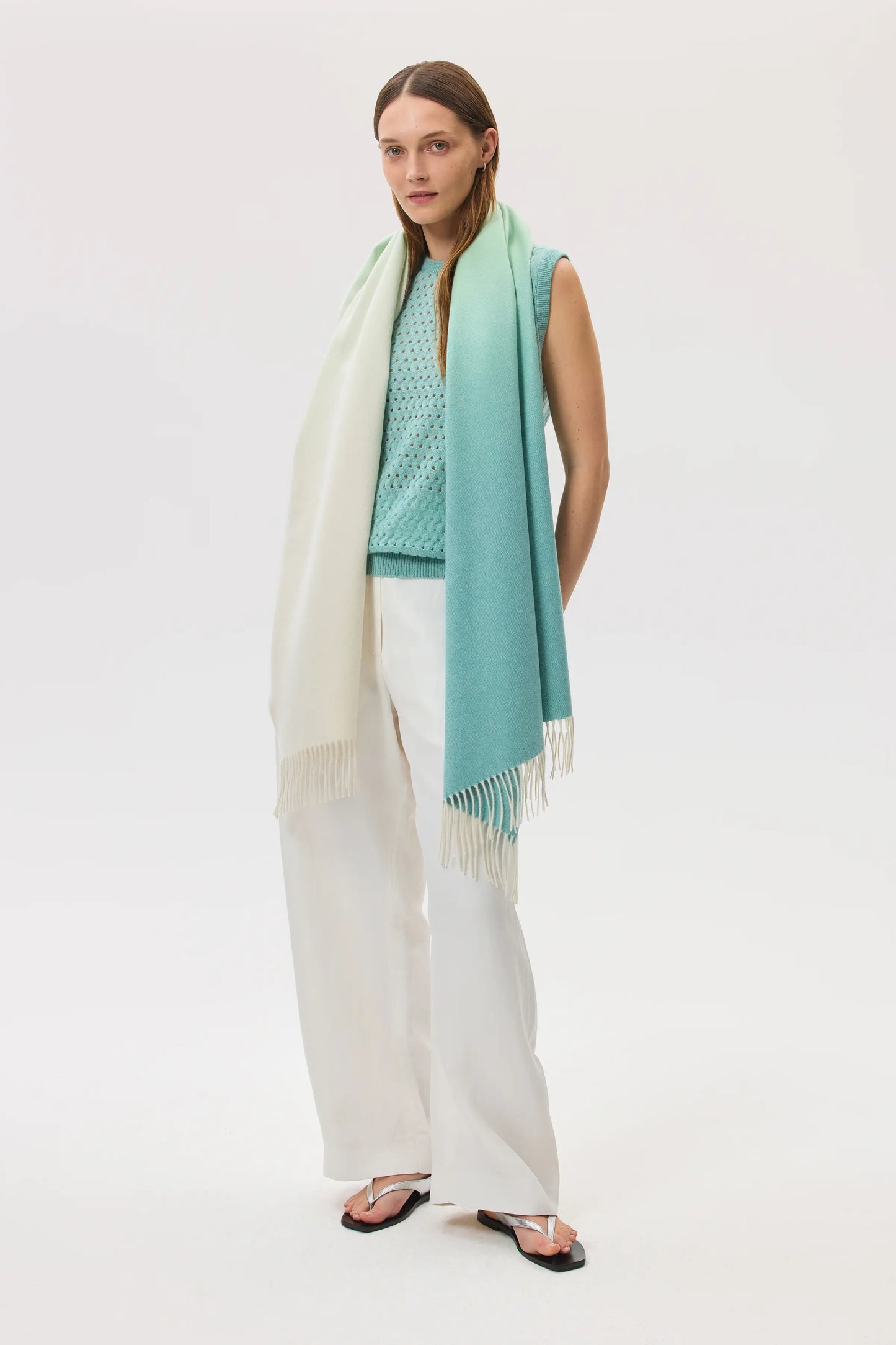 Jade green transitions to soft white in our ombré cashmere stole. We make our iconic Ombré pieces from start to finish in our own mills. We produce and dye our own yarn and blend numerous colours to achieve our signature ombré shades.