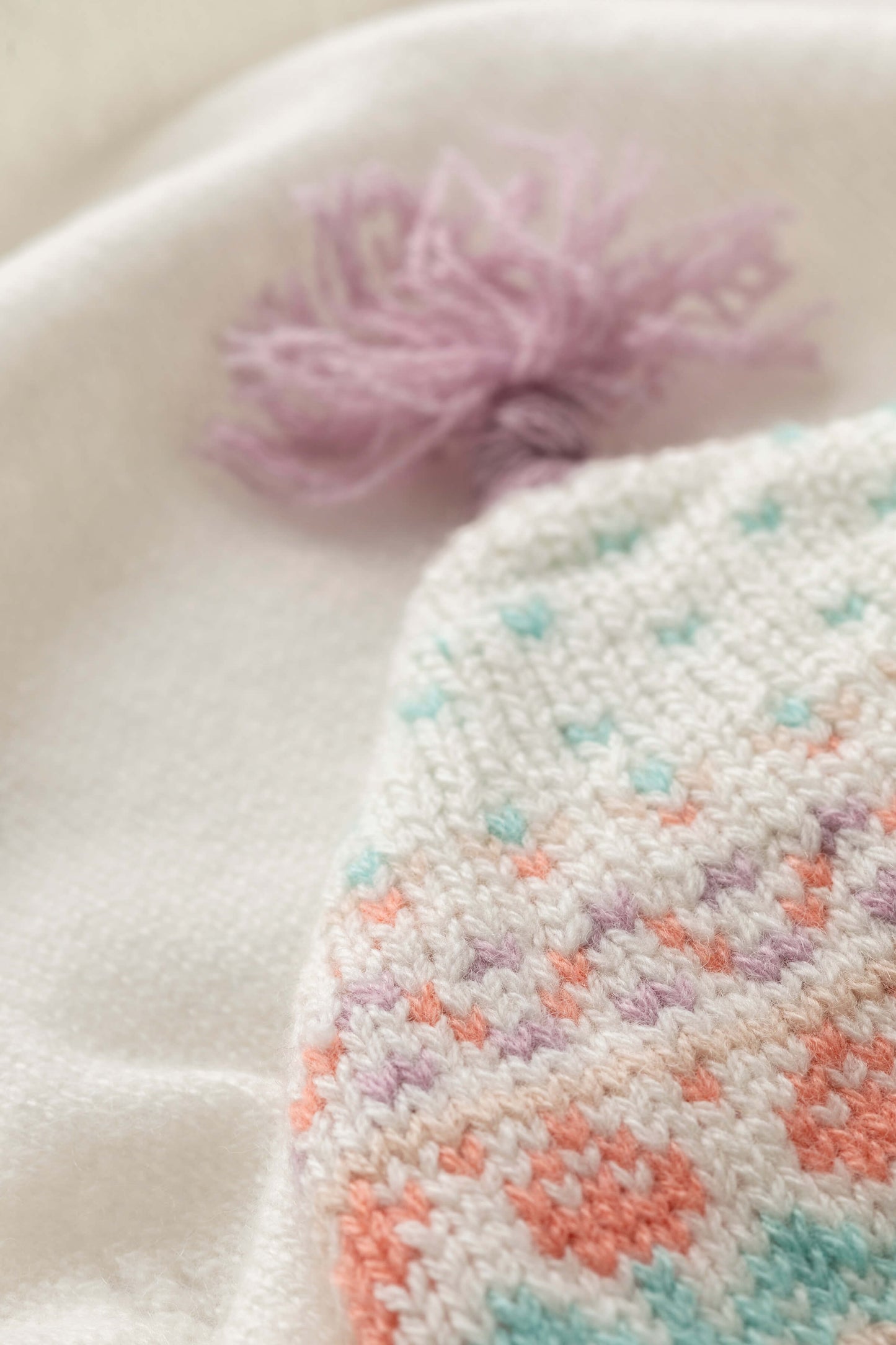 Made from the soft cashmere you love, our updated mauve pink Fairisle baby hat features new colours and delicate patterns, finished with cute tassels. Hand-knitted at our Elgin mill and trimmed with a delicate crochet edge.