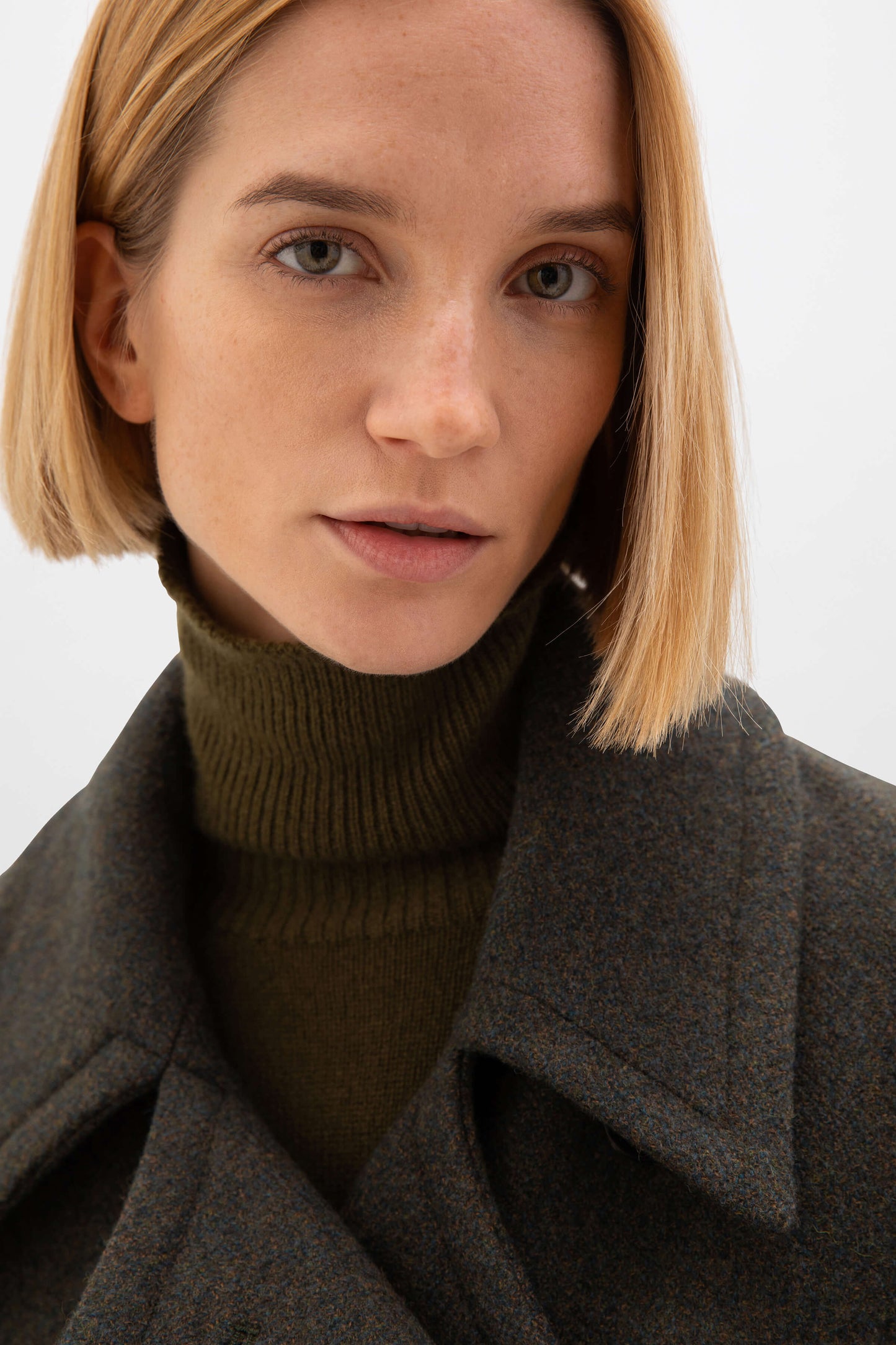 A statement piece for AW24, inspired by the Great Coat fabrics from our archives first developed over a hundred years ago. A fully lined, double-breasted coat with a relaxed tailored fit and wide collar. Compact, milled wool fabric gives a soft, smooth handle, while worsted yarn enhances strength and durability. Melange yarns give depth to the dark olive-hued herringbone structure.